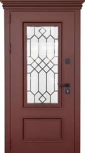 Металлофиленчатая термодверь с карнизом, стеклом, лазерной резкой и порошковым покрытием RAL 3011 предназначена для создания уютной, защищённой и стильной атмосферы. За счёт использования инновационных технологий дверь сохраняет свои свойства при перепадах температуры и влажности.